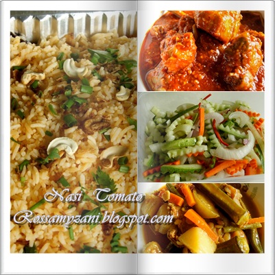 Errr...jemu dak, bila klik citer roti jala, klik lagi menten gambo toti jala? Mesti ada yang dah andaikan saya bz.Huhh....andaian itu sangaaattttt kurang tepat.Benonya 50-50. 50% adalah malassszz....50% bz..Alkisahnya set nasi tomato ni di tempah oleh kastemer yang sama.Maknanya 2 hari berturut dia order memandang ramai rakan kenalannya nak berkunjung ke rumah.Ye la..masih hangat beraya kan. Saling ziarah menziarahi. Alaa dia order untuk 20++ orang je.Tu yang saya terima.Leh masak lebih untuk family skali.Kan senang tu....jimat otak tak yah pikir menu apa untuk lunch.